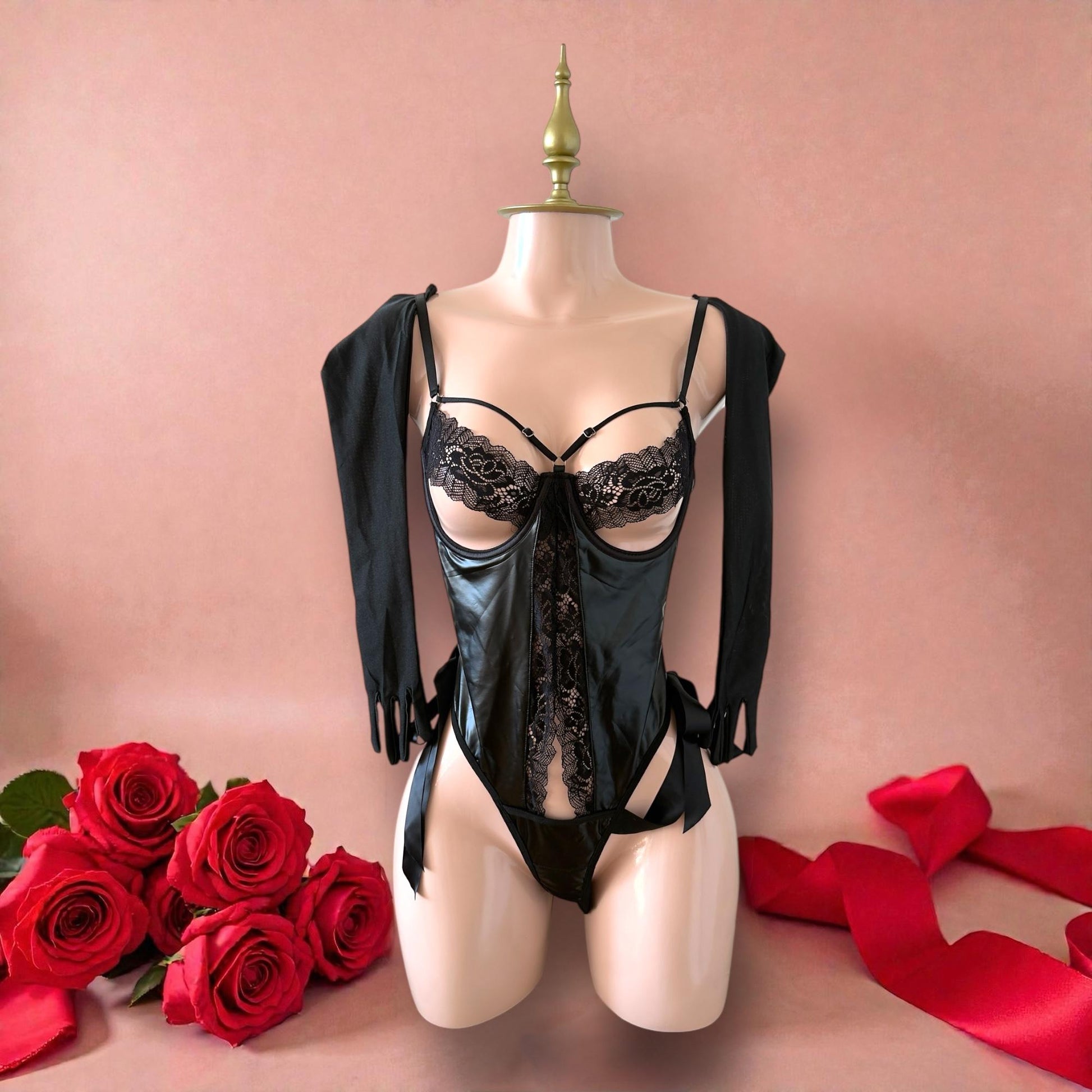 Este conjunto único combina un body de lencería con guantes largos 3/4 satinados integrados en un solo diseño innovador. Confeccionado en látex negro brillante con copas de encaje floral delicado, tirantes ajustables y mangas desmontables con lazos, este body crea un look dramático y elegante que realza la figura de manera espectacular.