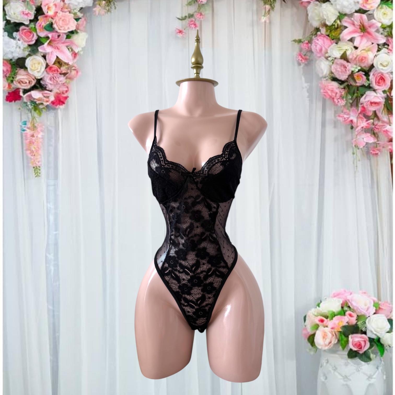 Luce elegante y sofisticada con este hermoso body negro de encaje con transparencias, perfecto para usar bajo ropa ajustada o en momentos especiales.