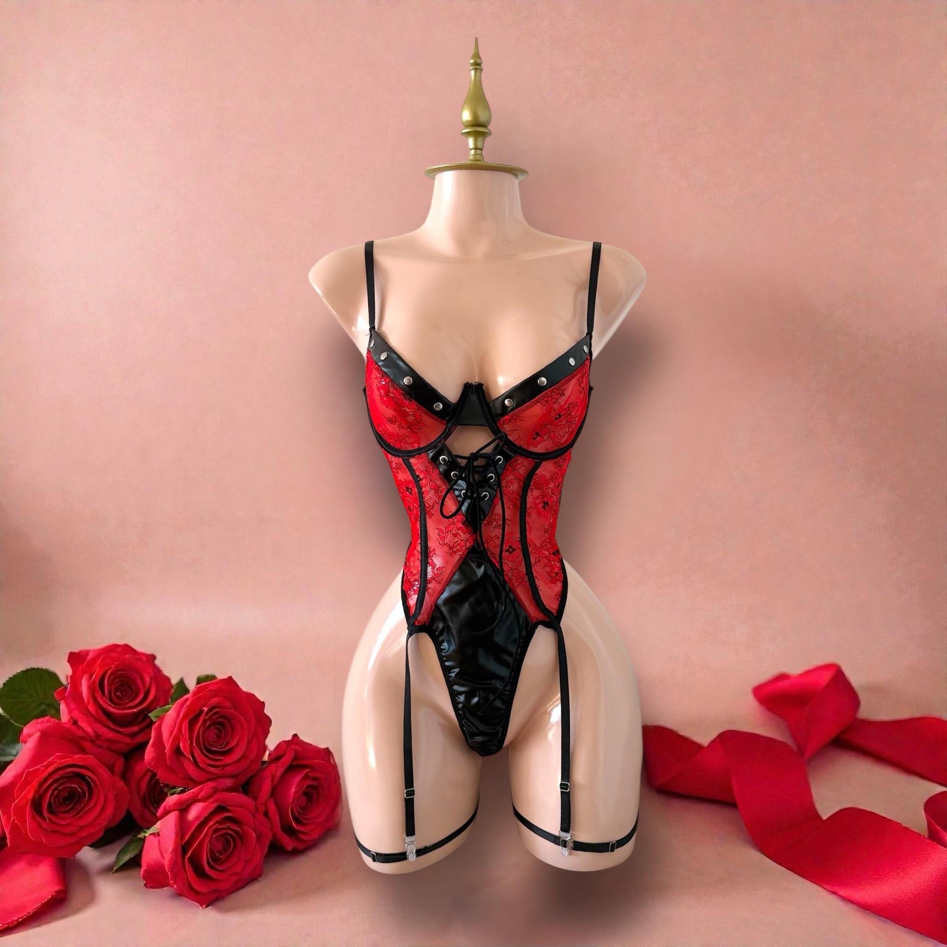 Este conjunto de 1 pieza combina sensualidad y elegancia con su diseño de encaje rojo floral y detalles de látex negro con tachuelas. El cut-out central con cordones ajustables y los ligueros integrados le dan un toque glamuroso y atrevido.