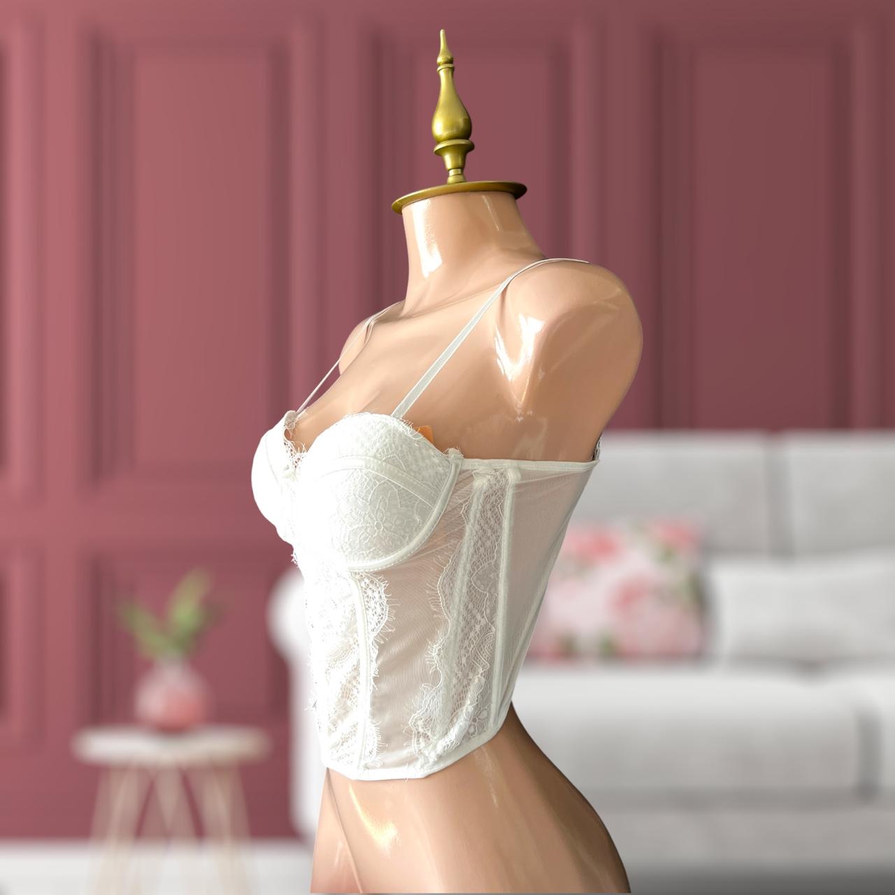 Desata tu lado más elegante y romántico con este hermoso bustier blanco con encaje floral delicado, copas con aro y cordones ajustables en la espalda, perfecto para momentos especiales llenos de pureza y sensualidad.