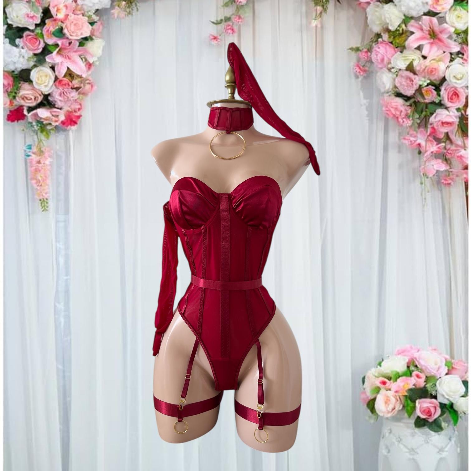 Este conjunto de 6 piezas combina elegancia y sensualidad con su diseño tipo corsé. El color rojo vino profundo y los detalles dorados le dan un toque de lujo y distinción.