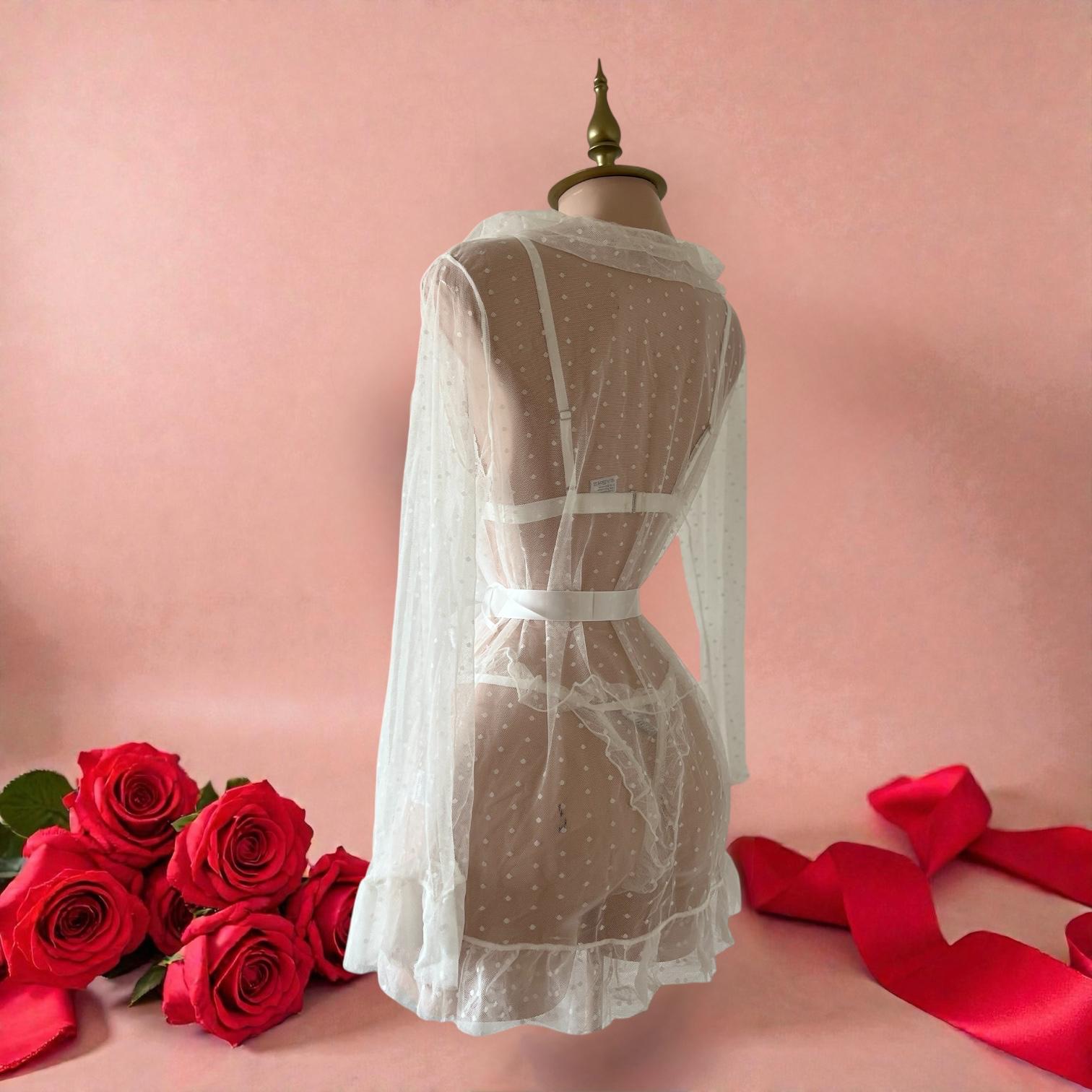 Este conjunto de 3 piezas combina romanticismo y sofisticación con su diseño de tul transparente con lunares brillantes y volantes delicados. El color blanco puro con detalles de encaje le dan un toque angelical y glamuroso.