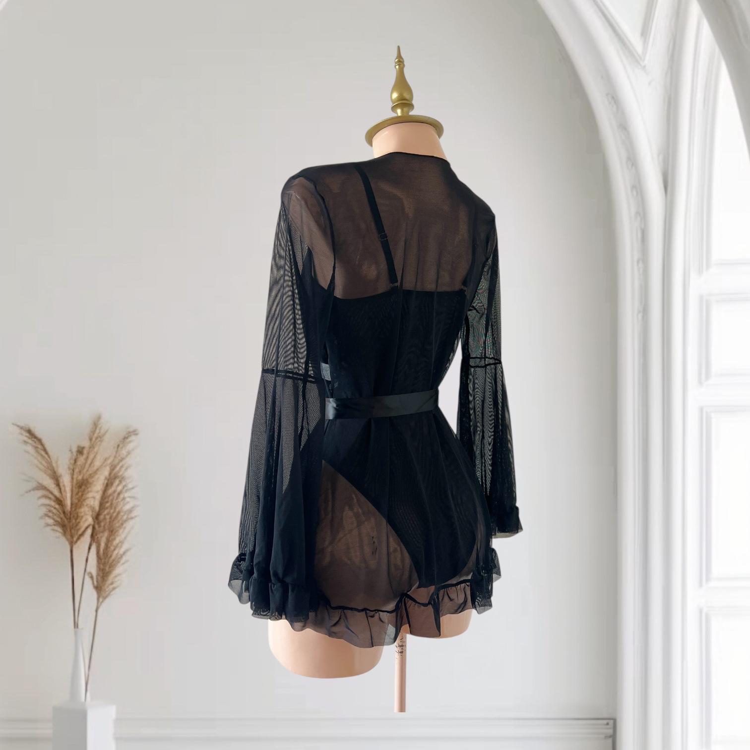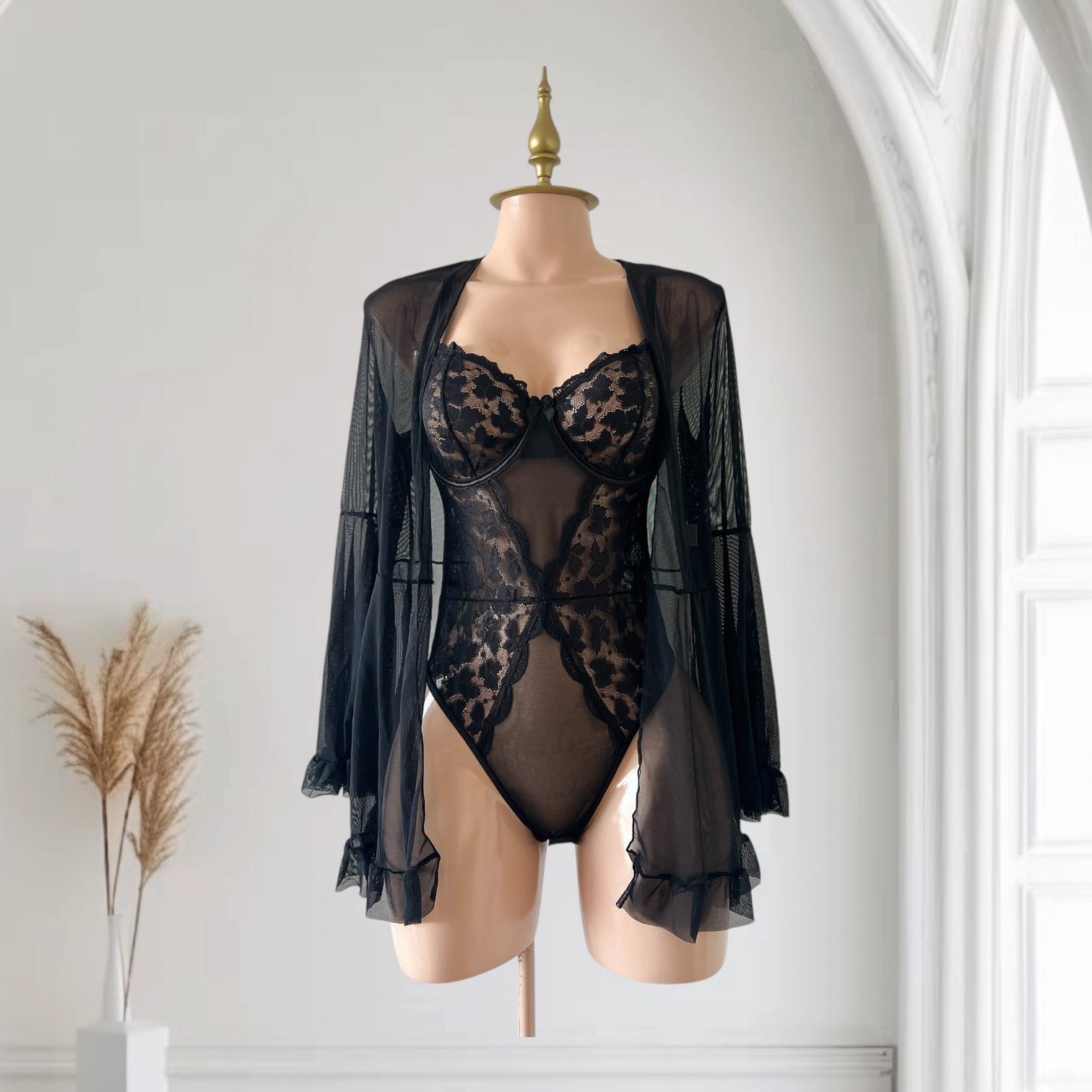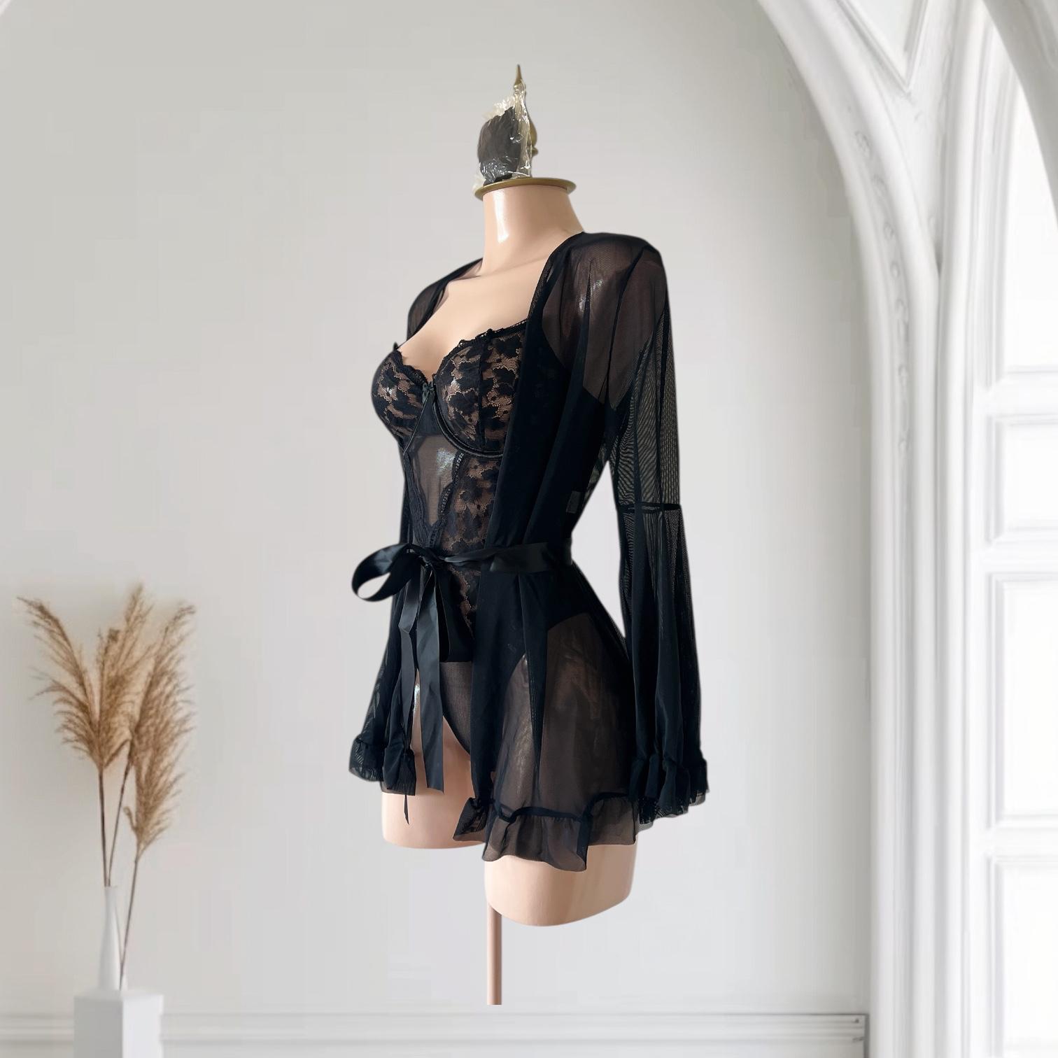 Deslumbra con este espectacular conjunto de pijama negro con body de encaje floral y bata de tul, perfecto para momentos especiales llenos de sofisticación y glamour.