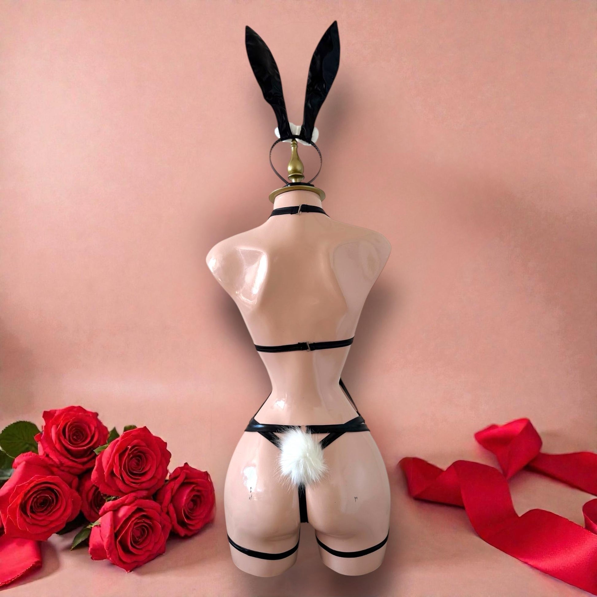 Deslumbra con este sensual disfraz de lencería tipo conejita en elegante color negro con diseño de arnés, perfecto para momentos especiales llenos de sensualidad y sofisticación.