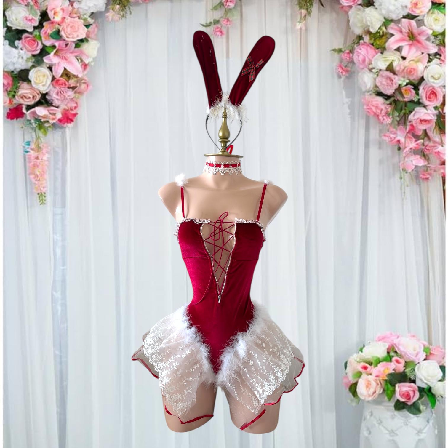 Sorprende con este glamuroso disfraz de lencería estilo conejita de terciopelo en satín rojo, perfecto para momentos especiales llenos de sensualidad y magia festiva.
