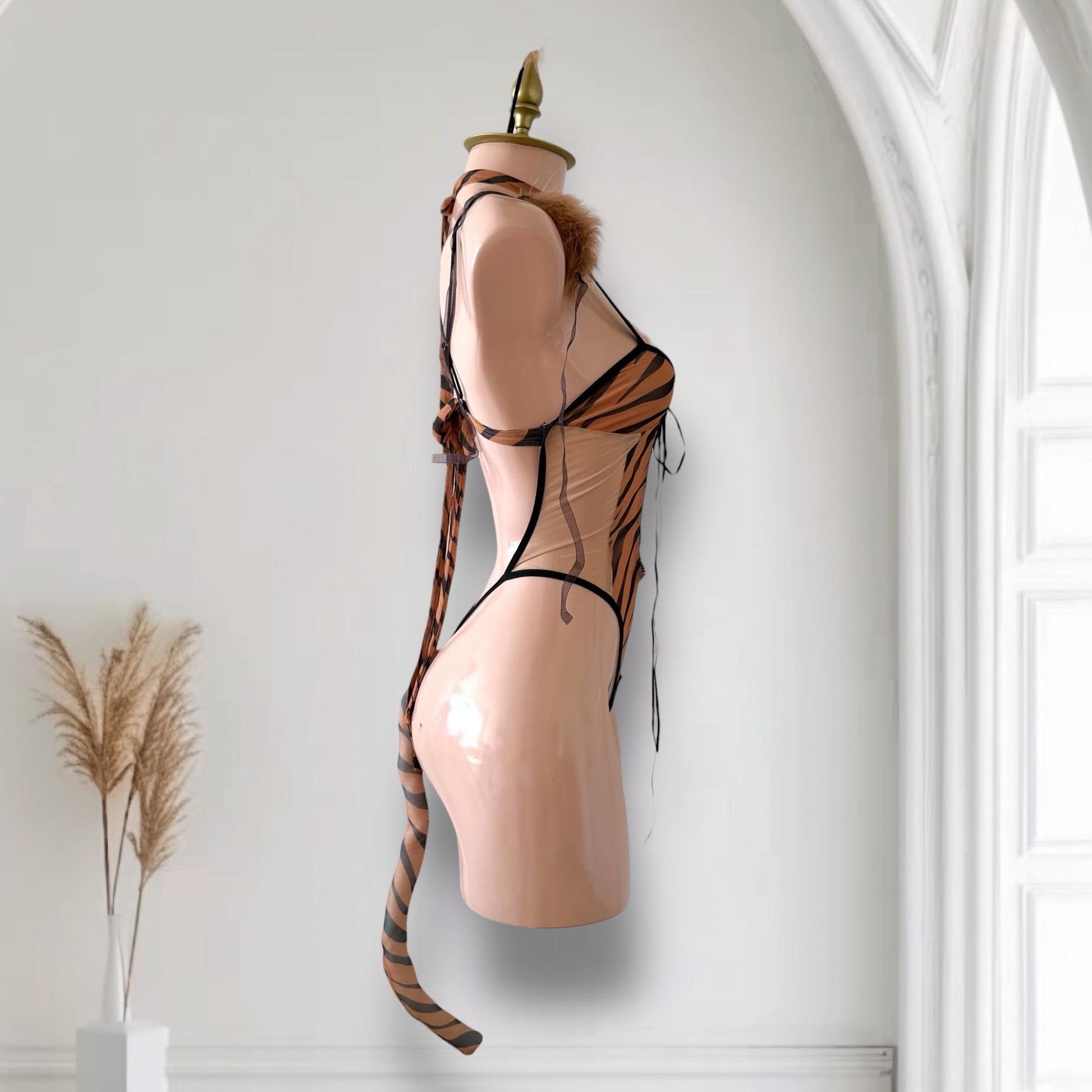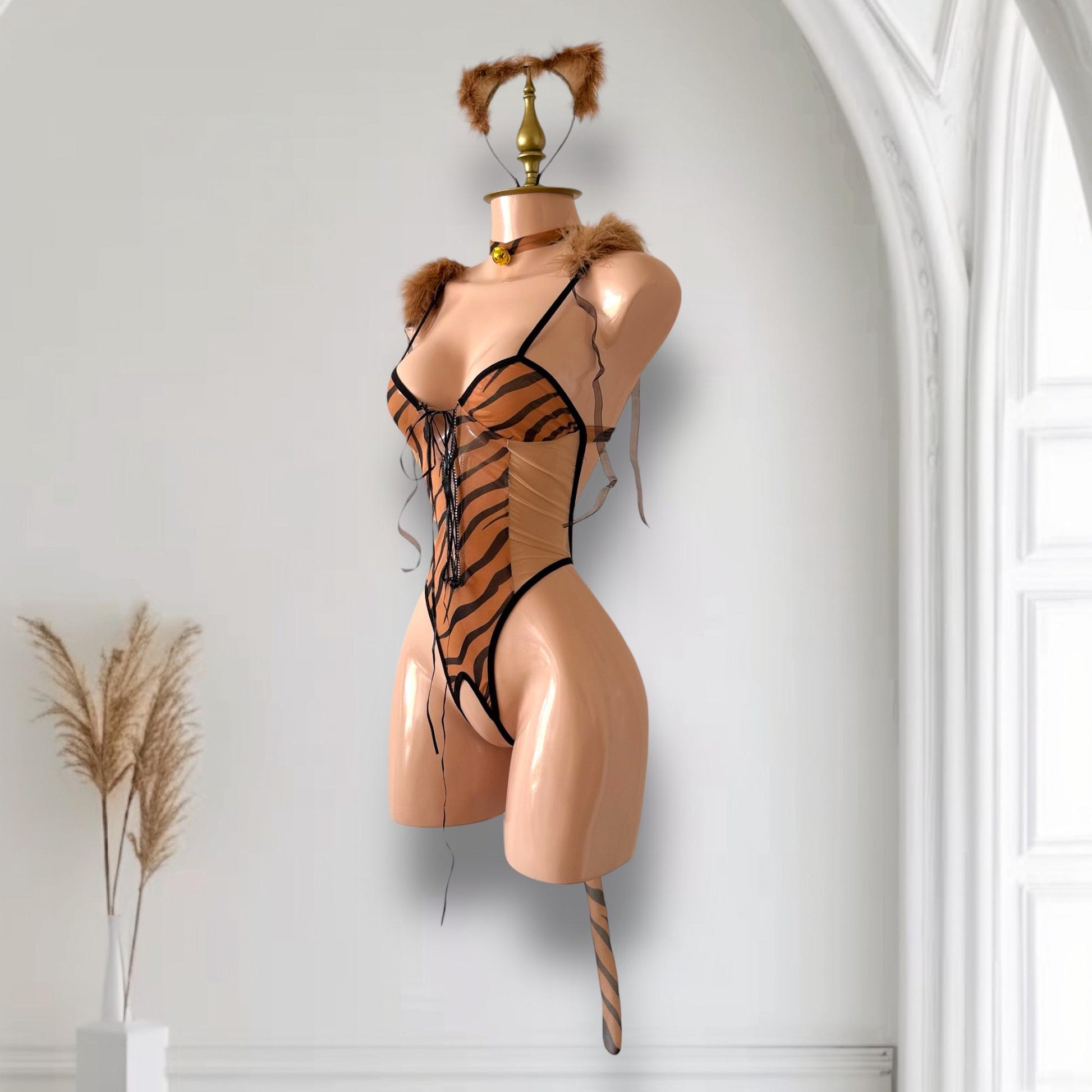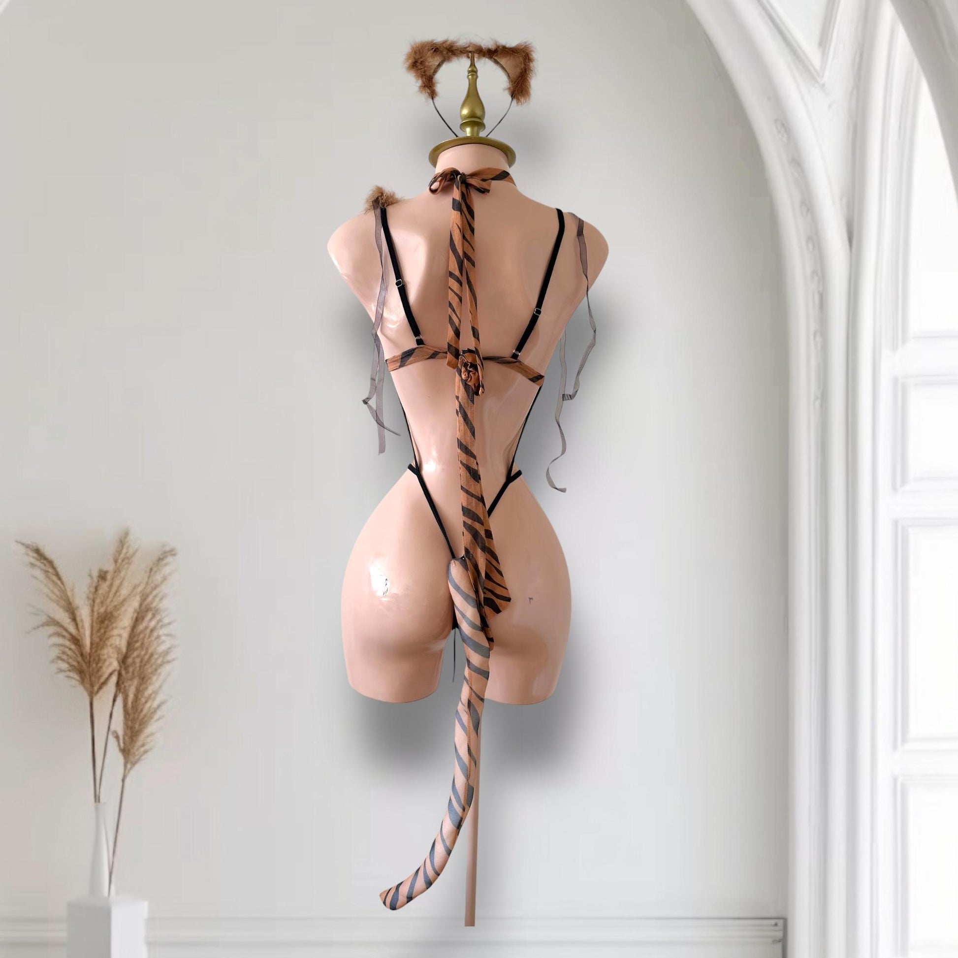 Este conjunto de 6 piezas combina sensualidad y fantasía con su diseño de estampado animal print. El body mesh con cordones ajustables, la cola decorativa y los accesorios completos crean un look glamuroso y atrevido.
