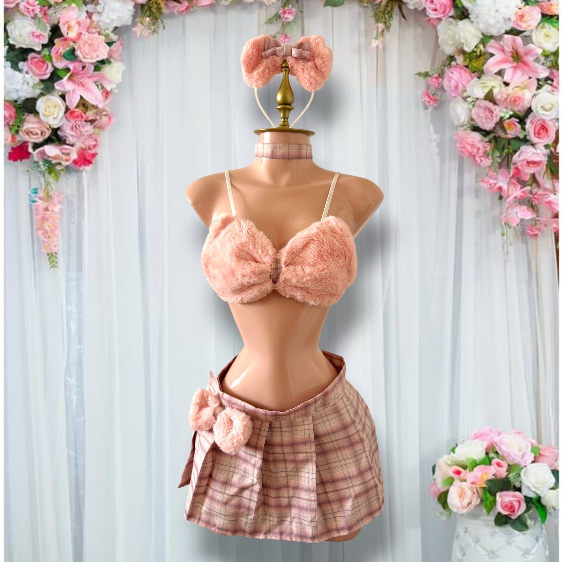 Este conjunto de 6 piezas combina sensualidad y ternura con su diseño inspirado en osita de peluche. El bralette de peluche rosa con minifalda a cuadros y accesorios decorativos le dan un toque único y adorable.