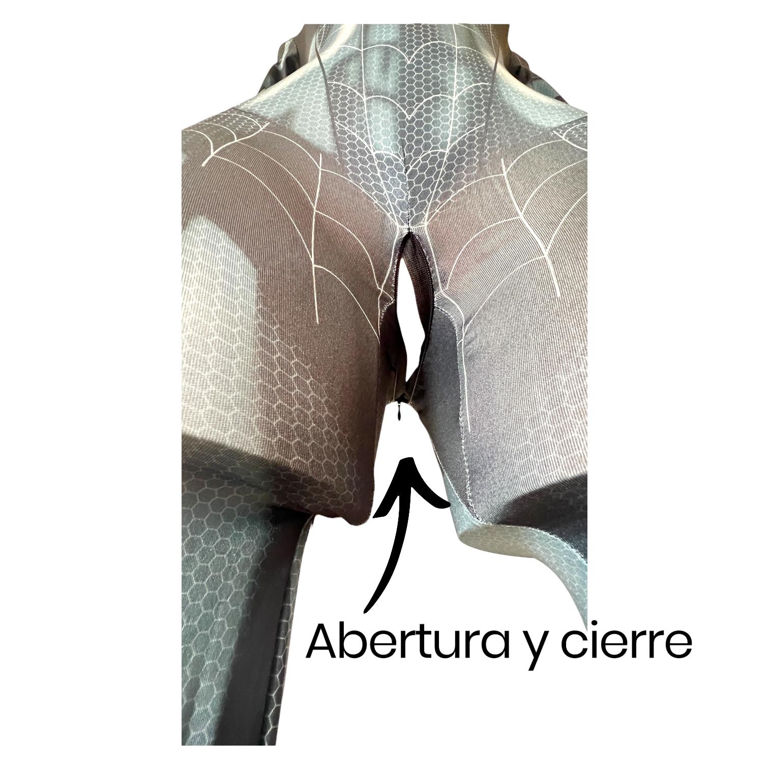 Este traje completo tipo bodysuit está confeccionado en material elástico de alta calidad y negro que imita el icónico traje Symbiote. El diseño incluye impresión digital de alta definición con telarañas blancas, textura tipo panal de abeja, el emblemático logo de araña en el pecho y la espalda, mangas largas con diseño de cuadrícula y shorts integrados con abertura y cierre en la entrepierna para mayor comodidad.