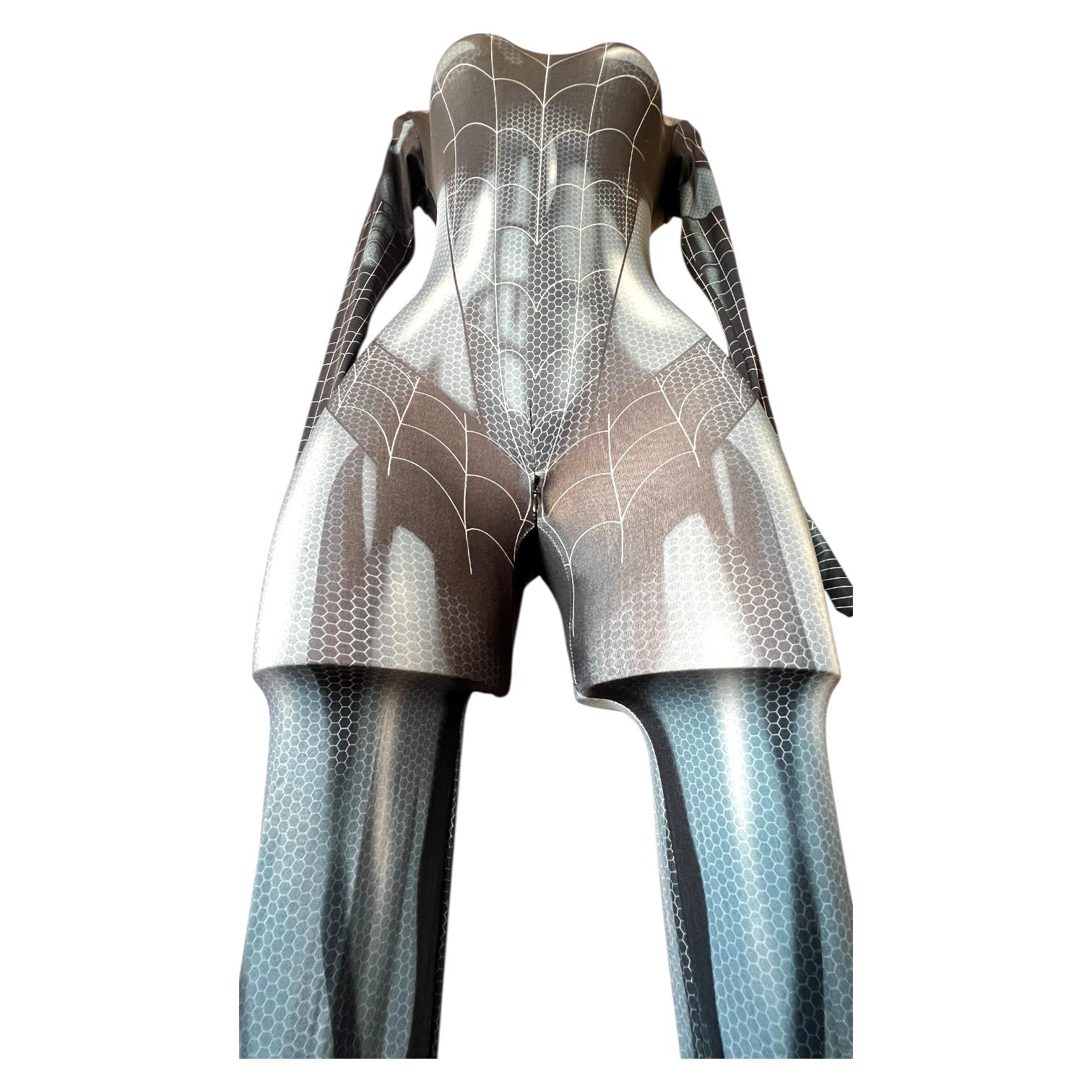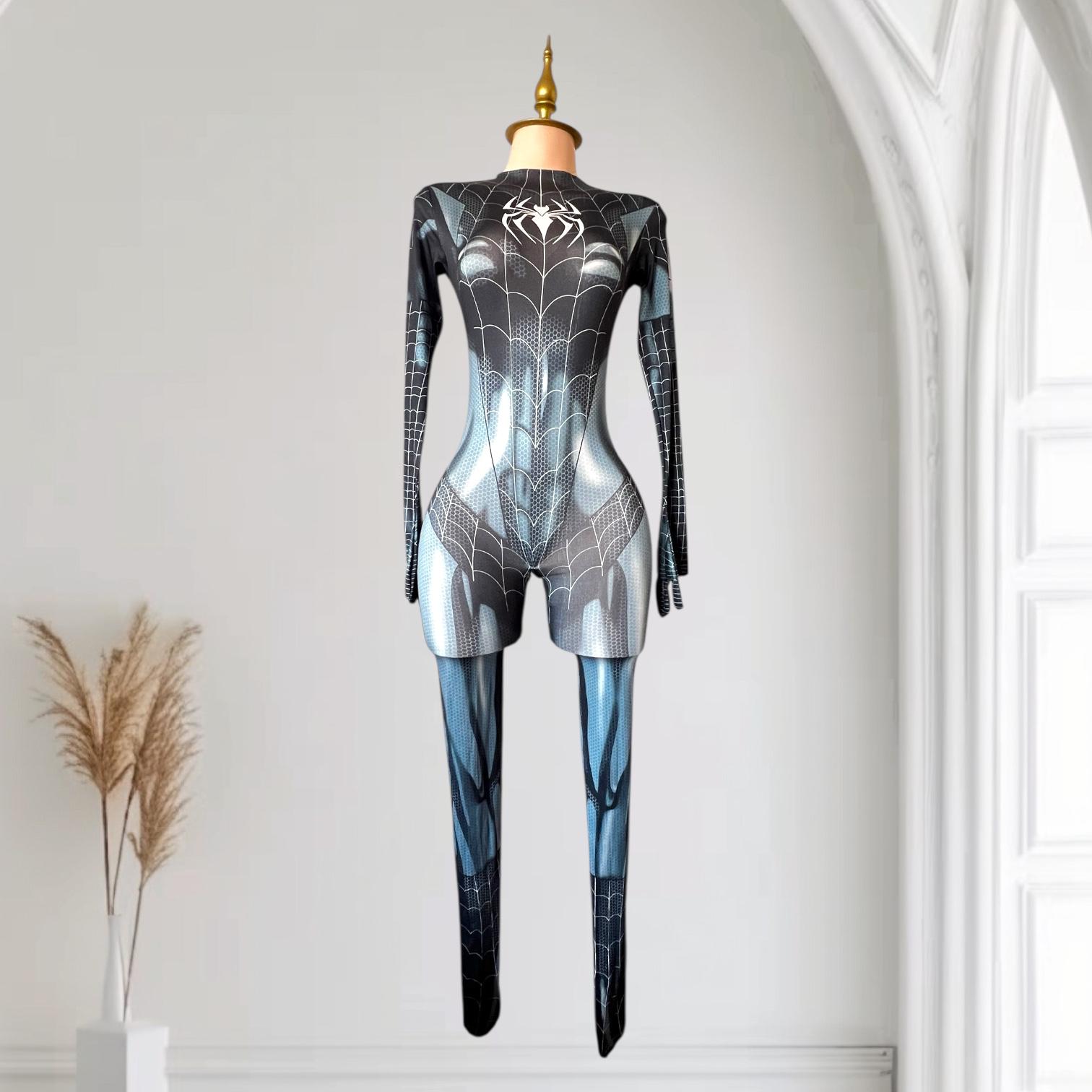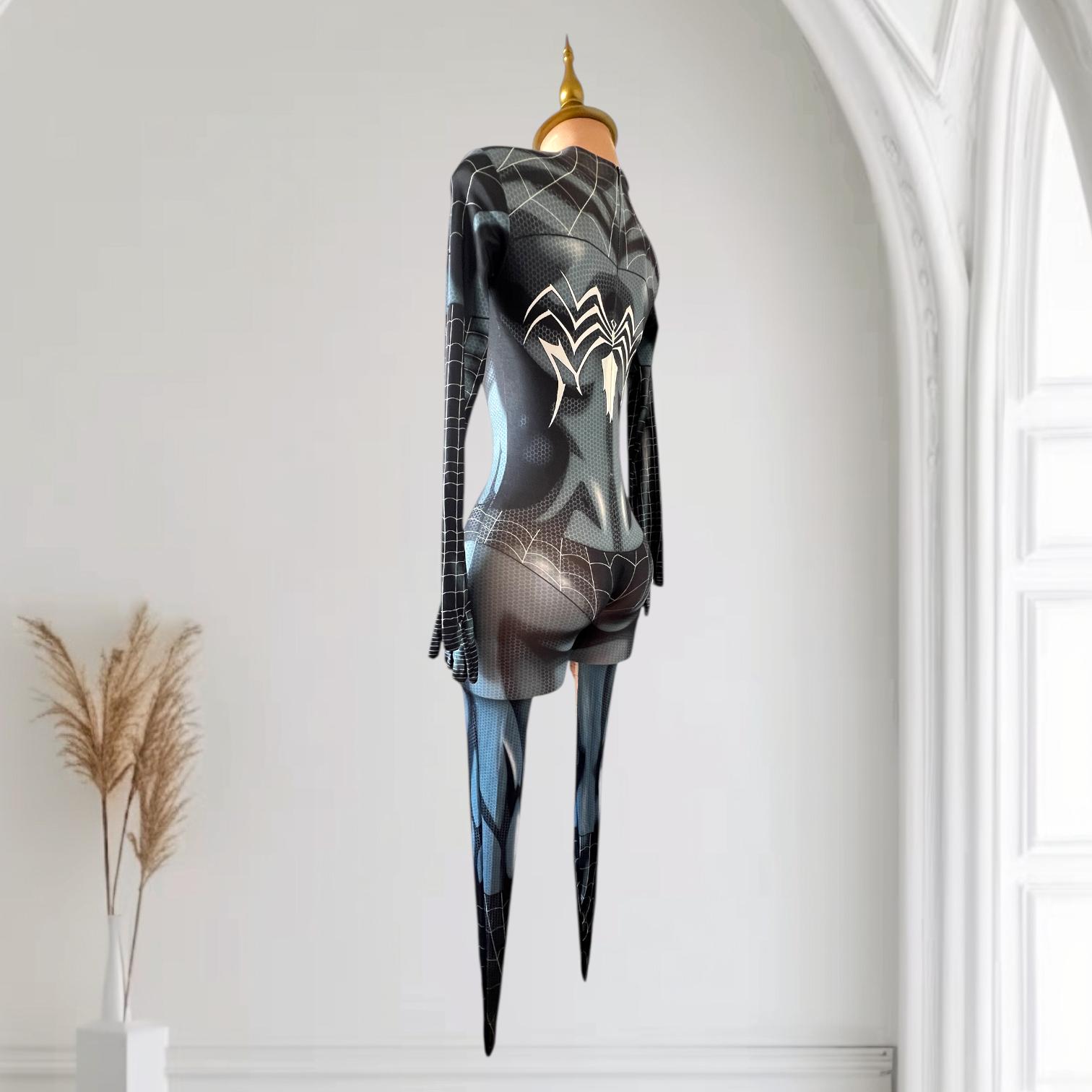 Conviértete en la poderosa Spider Woman con este espectacular disfraz completo estilo Symbiote con detalles de telaraña, perfecto para cosplay, convenciones, Halloween y fiestas temáticas de superhéroes.