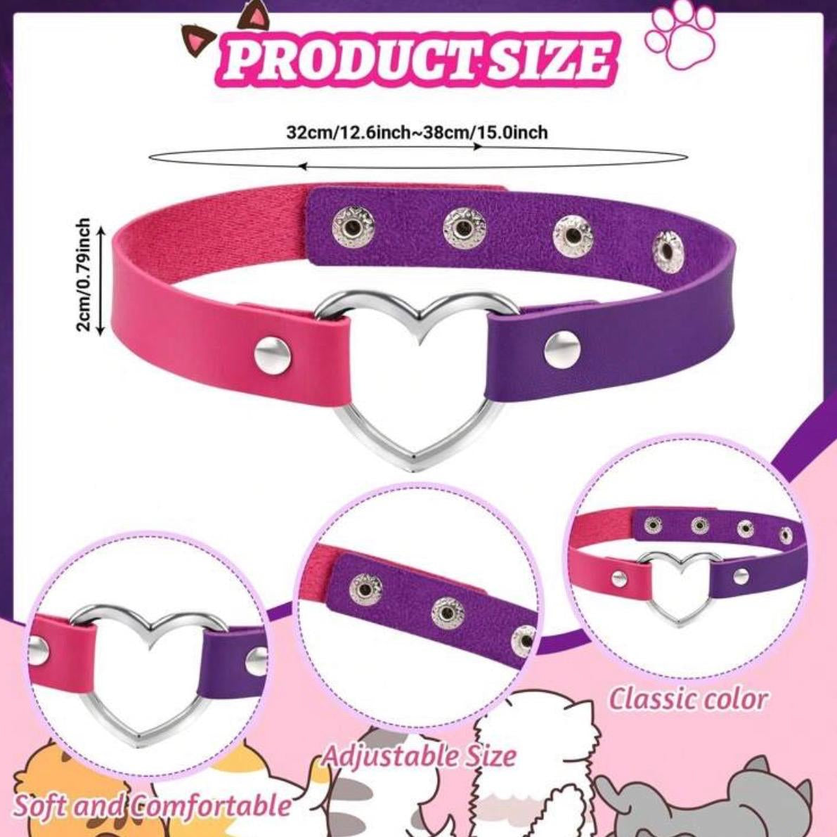 - Choker con corazón - Bicolor rosa y morado con argolla de corazón plateada (32-38 cm ajustable x 2 cm de ancho)