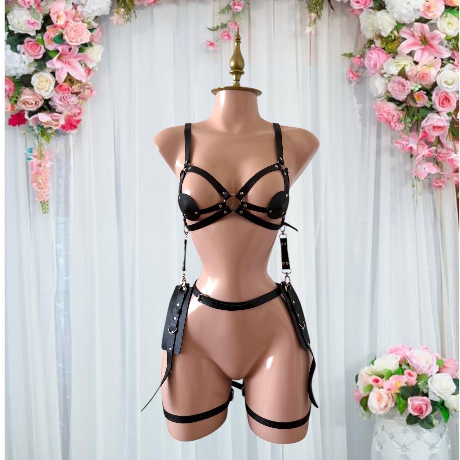 Este conjunto completo de 4 piezas combina sensualidad y estilo fetish con su diseño de tiras de cuero sintético negro y múltiples hebillas ajustables. El arnés de busto con gargantilla, el cinturón de cintura, los ligueros y las tiras de piernas crean un look dramático y poderoso que realza la figura.